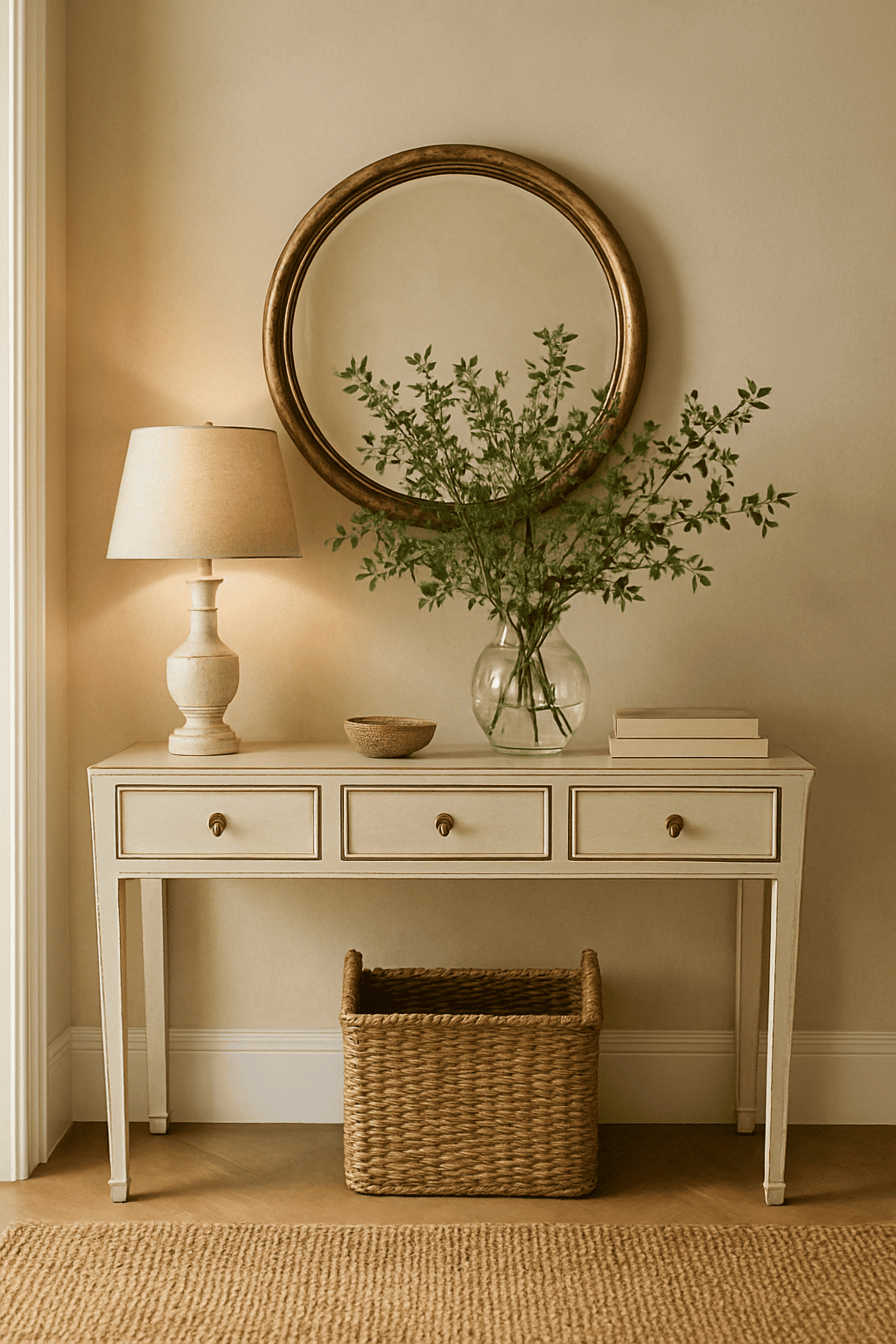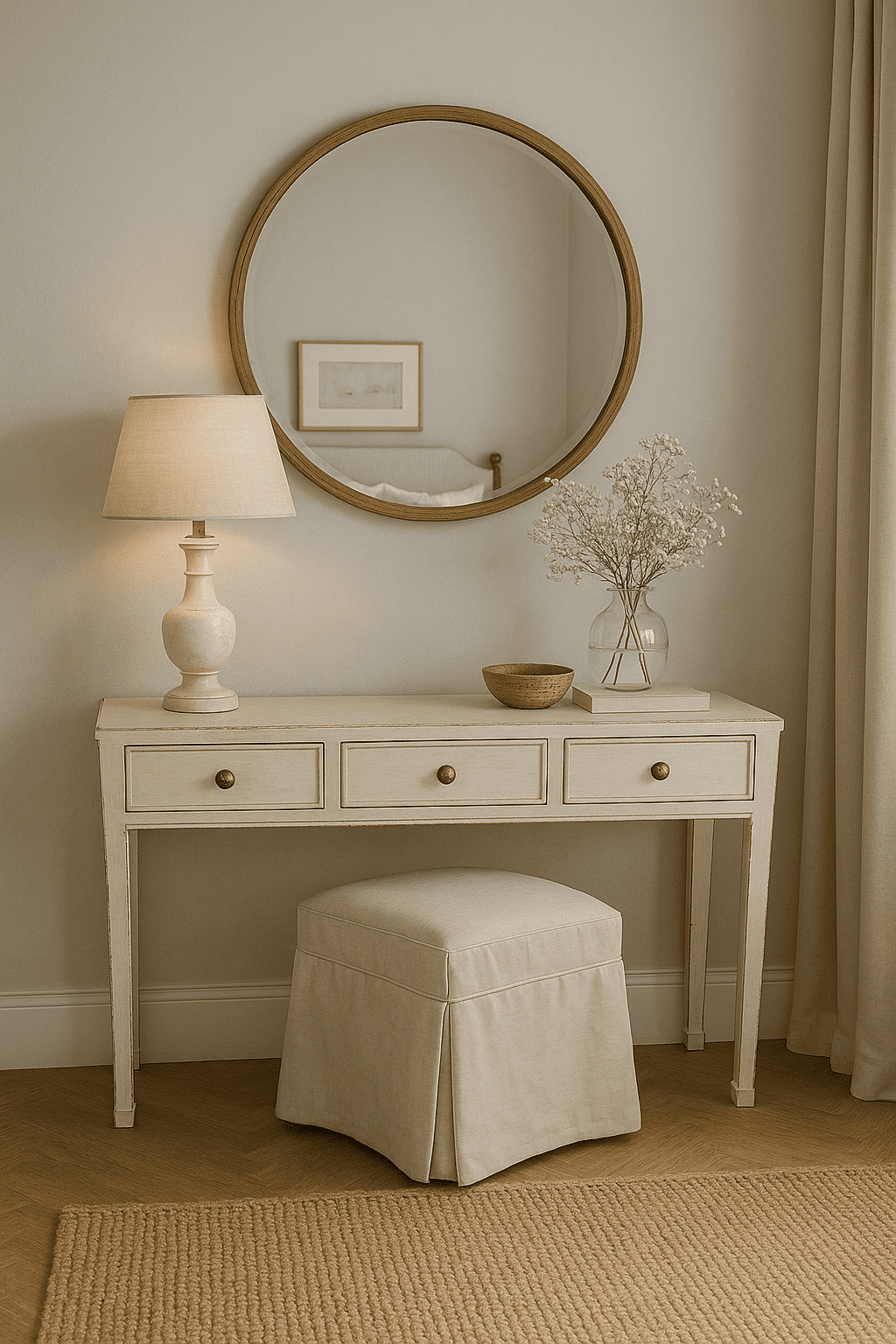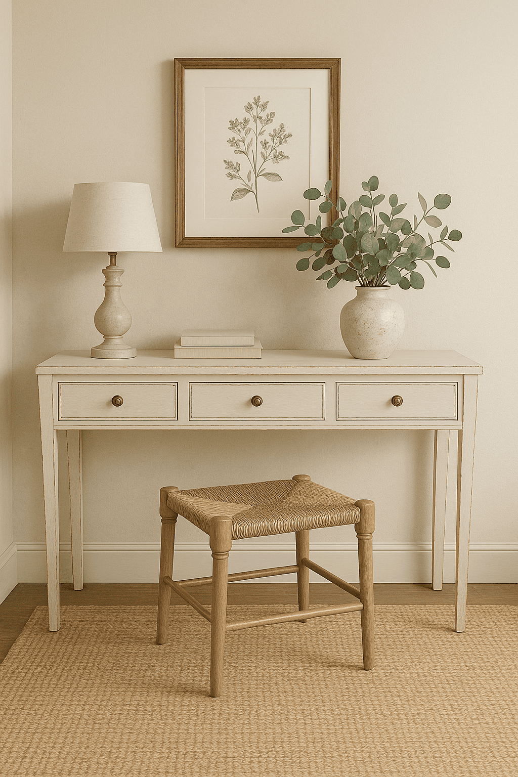 Consola de madera laqueada blanca con efecto envejecido de 3 cajones. Es muy versátil y podés darle muchos usos según su ubicación. Ideal para usarla como recibidor, mesa de tocador, como superficie secundaria en un living, o para un rincón de estudio.